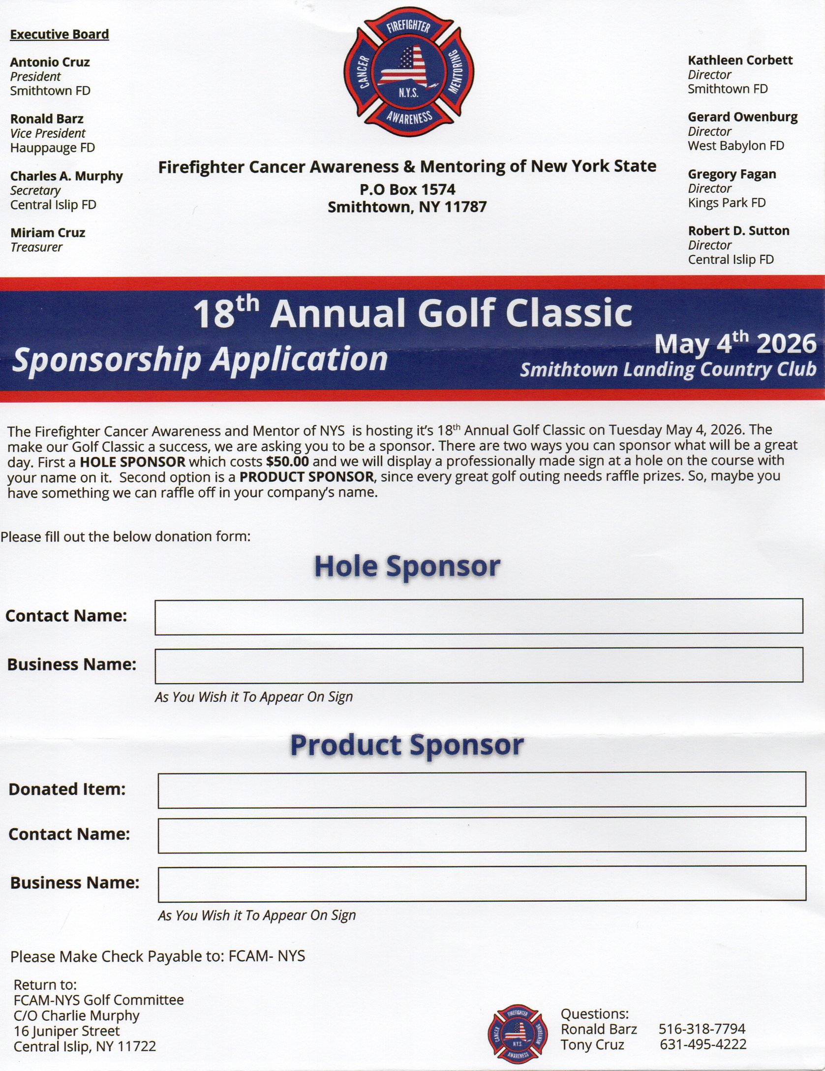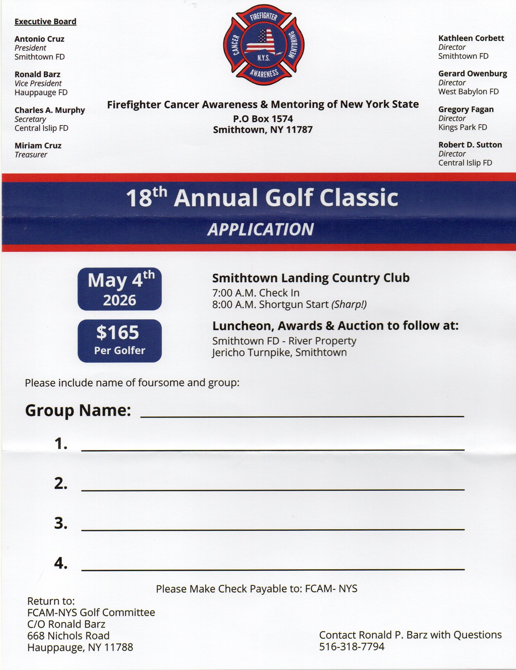 | THE ANNUAL GOLF OUTING OF THE FIREFIGHTER CANCER AWARENESS & MENTORING OF NEW YORK STATE IS SCHEDULED FOR MONDAY, MAY 4, 2026 AT THE SMITHTOWN LANDING COUNTRY CLUB ON LANDING AVENUE IN SMITHTOWN, NY 11787.